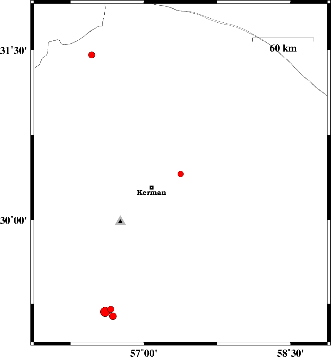 | 2017/01/22 | 19:46:40.5 | 23:16:40.5 | 30.407 | 57.376 | 14 | ML:2.7 | Kerman Province, 31 km North-East of Kerman | ||