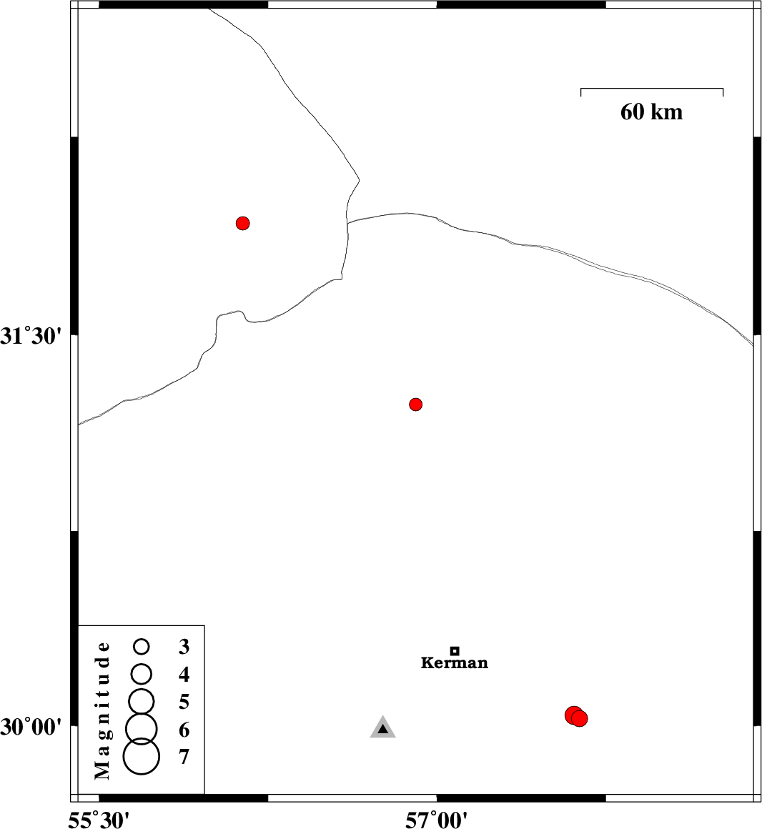 | 2017/01/26 | 05:54:37.9 | 09:24:37.9 | 30.04 | 57.609 | 14 | ML:3.6 | Kerman Province, 58 km South-East of Kerman |
