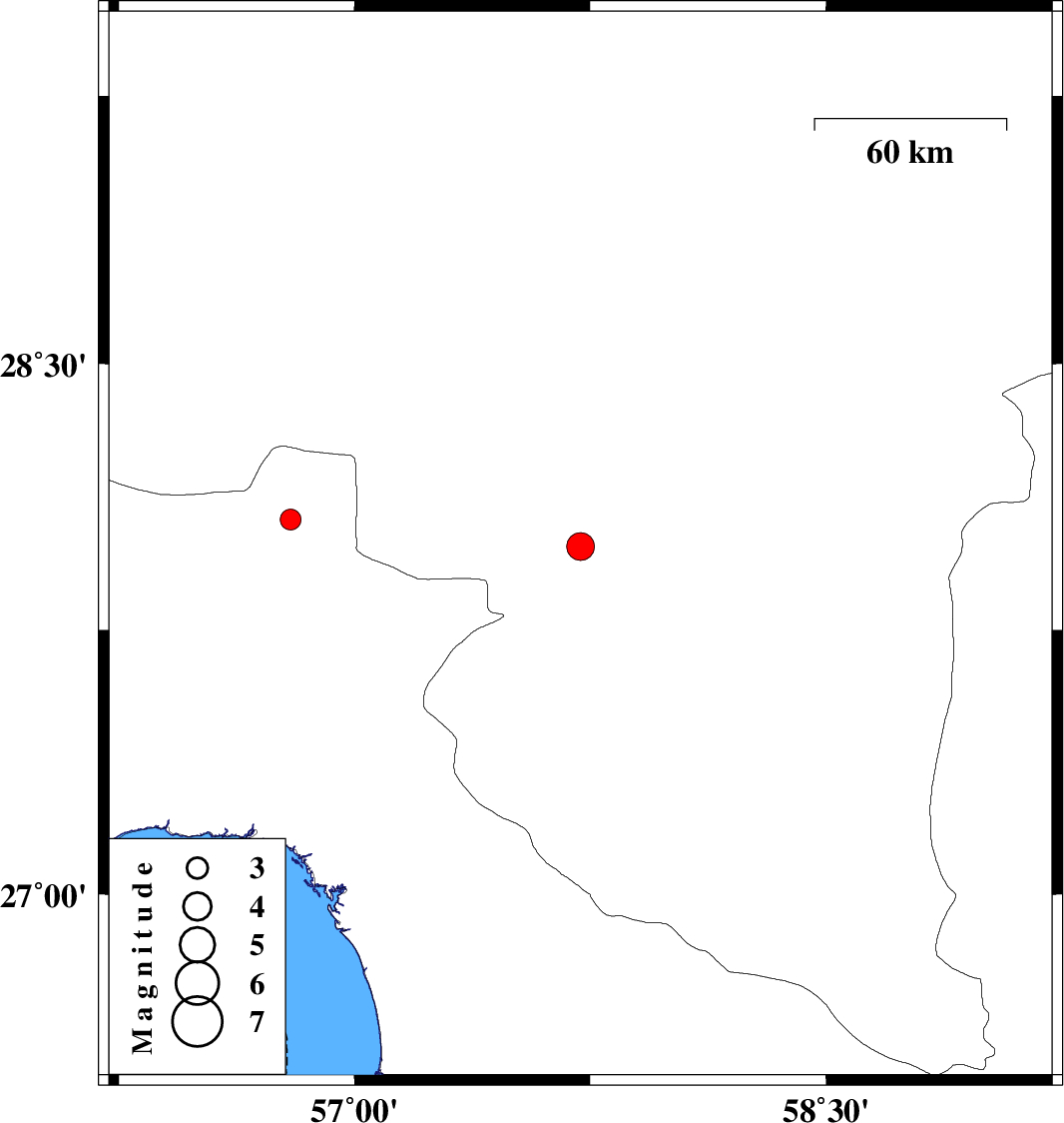 | 2017/02/22 | 01:57:18.2 | 05:27:18.2 | 27.986 | 57.719 | 28 | ML:4 | Kerman Province, 5 km of Kahnuj | ||