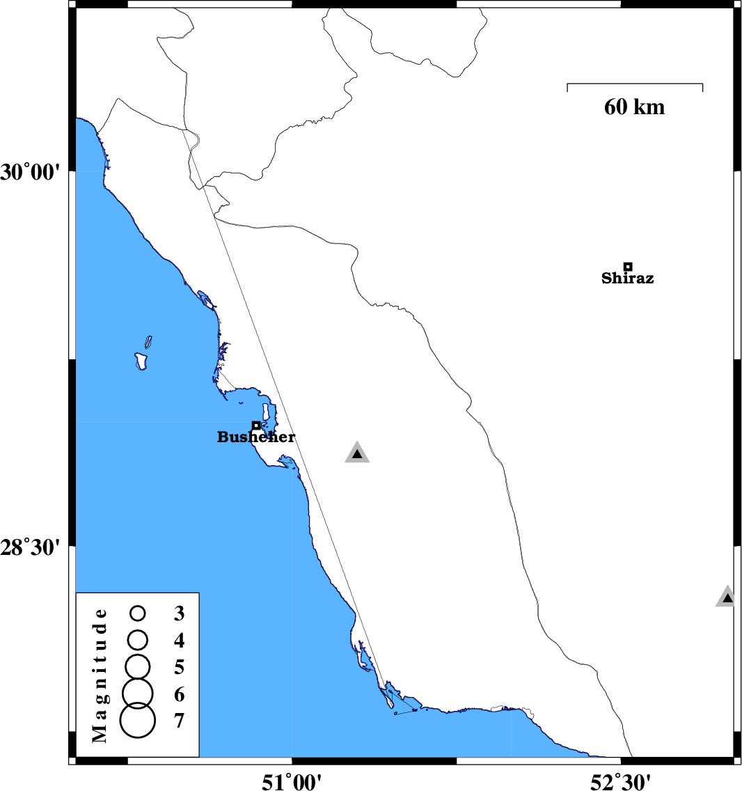 | 2017/02/24 | 03:47:59.1 | 07:17:59.1 | 29.146 | 51.514 | 14 | ML:3.3 | Bushehr Province, 33 km South-East of Borazjan |