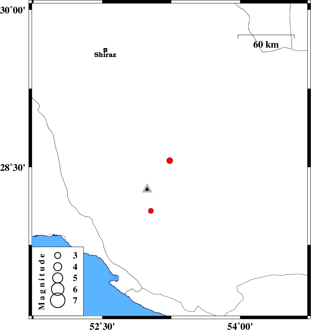 | 2017/02/21 | 10:02:00.5 | 13:32:00.5 | 28.078 | 53.029 | 14 | ML:2.6 | Fars Province, 43 km South of Qir va Karzin |