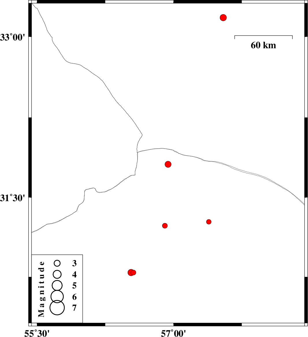 | 2017/01/31 | 10:49:40.6 | 14:19:40.6 | 31.234 | 56.906 | 14 | ML:2.6 | Kerman Province, 10 km of Ravar |
