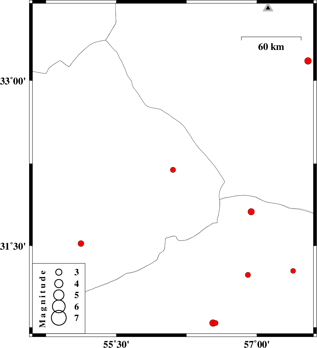 | 2017/01/31 | 10:49:40.6 | 14:19:40.6 | 31.234 | 56.906 | 14 | ML:2.6 | Kerman Province, 10 km of Ravar |