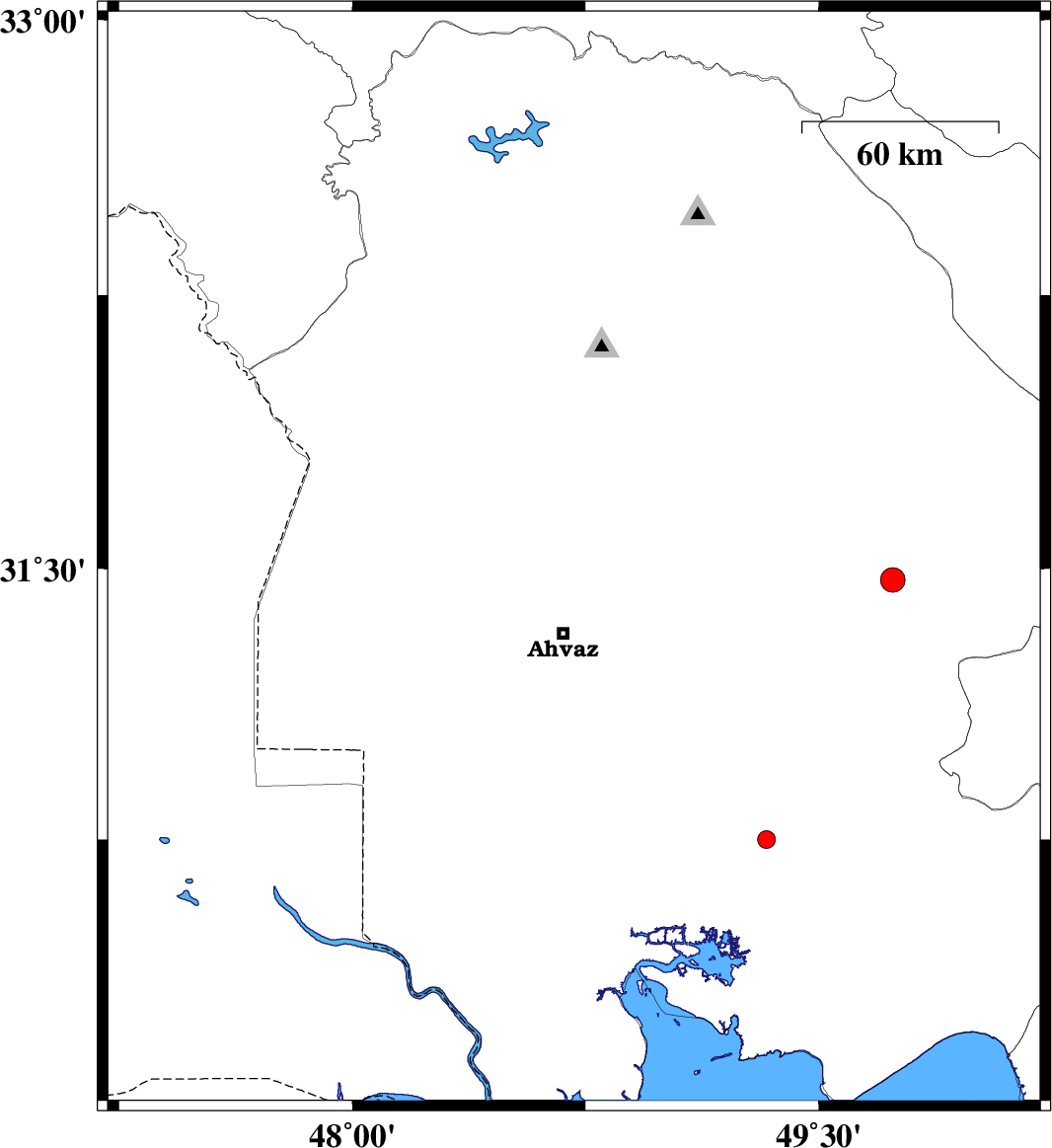 | 2017/03/27 | 01:56:53.6 | 06:26:53.6 | 31.523 | 48.713 | 15 | ML:2.5 | Khoozestan Province, 23 km North of Ahvaz | ||