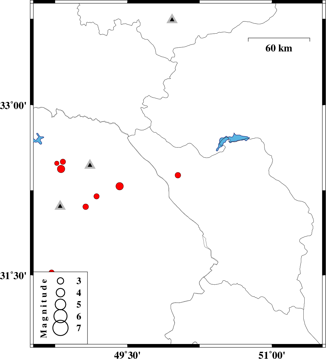 | 2017/03/27 | 01:56:53.6 | 06:26:53.6 | 31.523 | 48.713 | 15 | ML:2.5 | Khoozestan Province, 23 km North of Ahvaz |