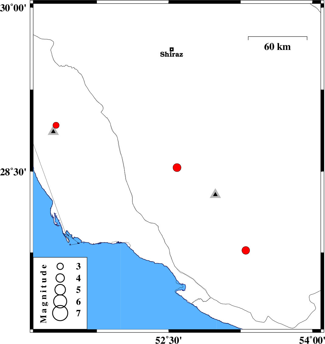 | 2017/04/27 | 17:21:47.2 | 21:51:47.2 | 28.536 | 52.587 | 5 | ML:3.8 | Fars Province, 32 km South of Firuz Abad | ||