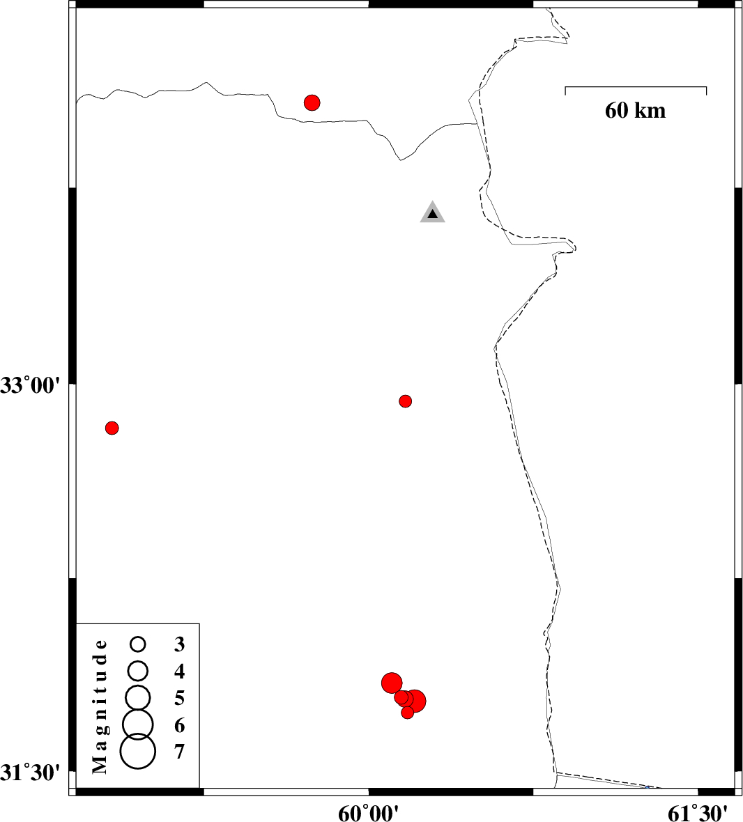 | 2017/04/04 | 15:49:25.2 | 20:19:25.2 | 31.788 | 60.148 | 14 | ML:2.8 | Khorasan(south) Province, 30 km North-East of Nehbandan | ||