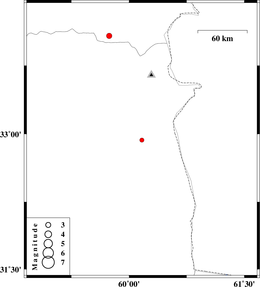 | 2017/04/29 | 10:13:29.6 | 14:43:29.6 | 32.933 | 60.167 | 14 | ML:2.5 | Khorasan(south) Province, 49 km North-East of Sarbisheh |
