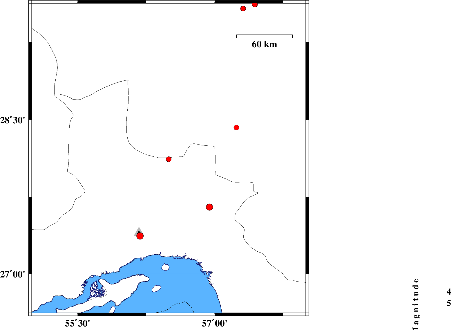| 2017/04/28 | 05:07:08.3 | 09:37:08.3 | 27.652 | 56.944 | 14 | ML:3.2 | Hormozgan Province, 38 km North-West of Dehbarez | ||