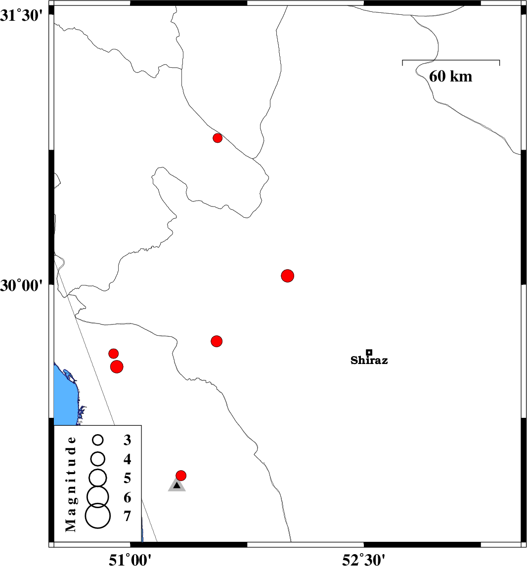 | 2017/04/22 | 05:01:57.4 | 09:31:57.4 | 28.925 | 51.325 | 14 | ML:3 | Bushehr Province, 8 km of Ahram | ||
