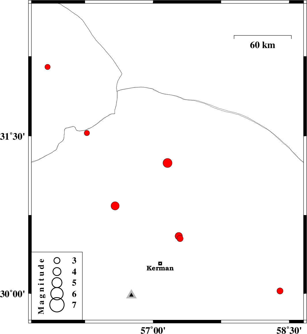 | 2017/04/20 | 05:40:16.7 | 10:10:16.7 | 30.55 | 57.283 | 15 | ML:3.6 | Kerman Province, 35 km North-East of Kerman | ||