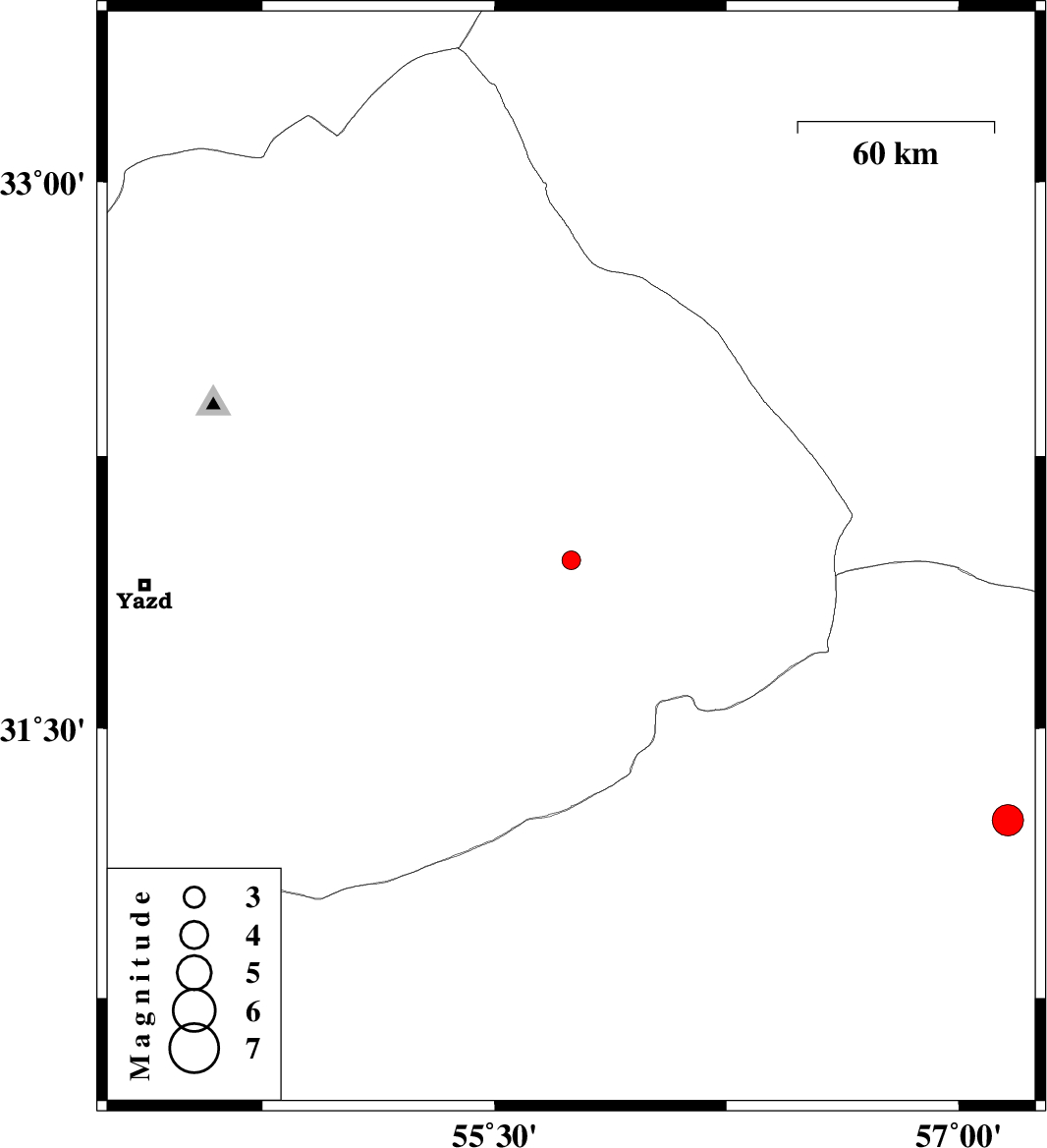 | 2017/05/10 | 06:10:12.2 | 10:40:12.2 | 31.964 | 55.748 | 16 | ML:2.7 | Yazd Province, 52 km North-East of Bafq | ||