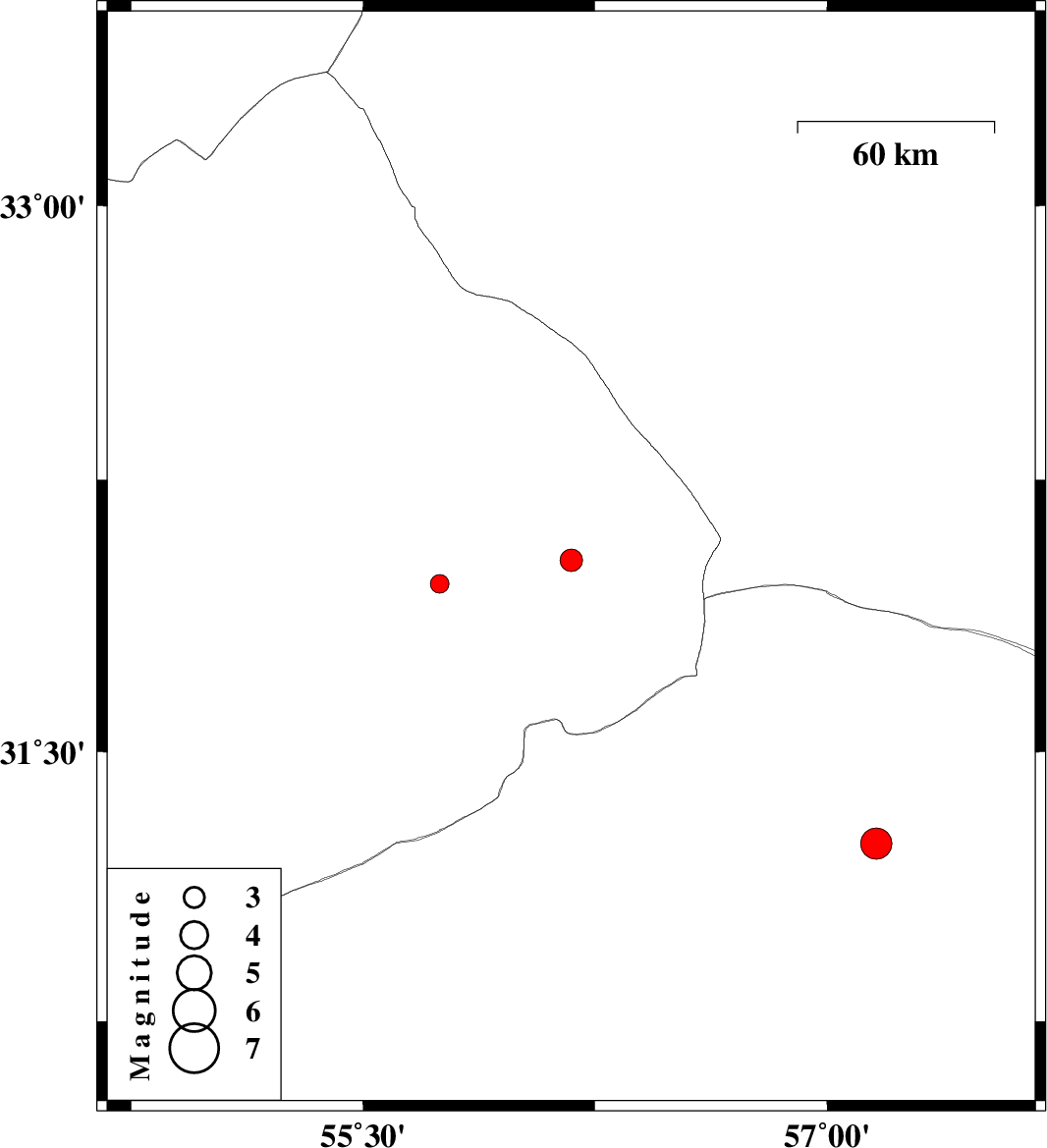 | 2017/05/11 | 01:26:57.1 | 05:56:57.1 | 32.029 | 56.173 | 14 | ML:3.3 | Yazd Province, 87 km North-East of Bafq | ||