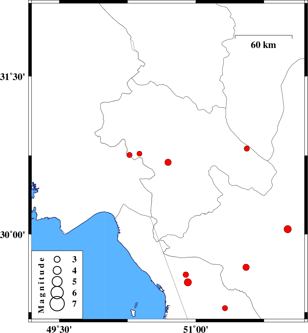 | 2017/04/28 | 07:23:45.4 | 11:53:45.4 | 30.815 | 51.56 | 15 | ML:2.7 | Kohkiluieh va boyerahmad Province, 11 km -East of Sisakht | ||