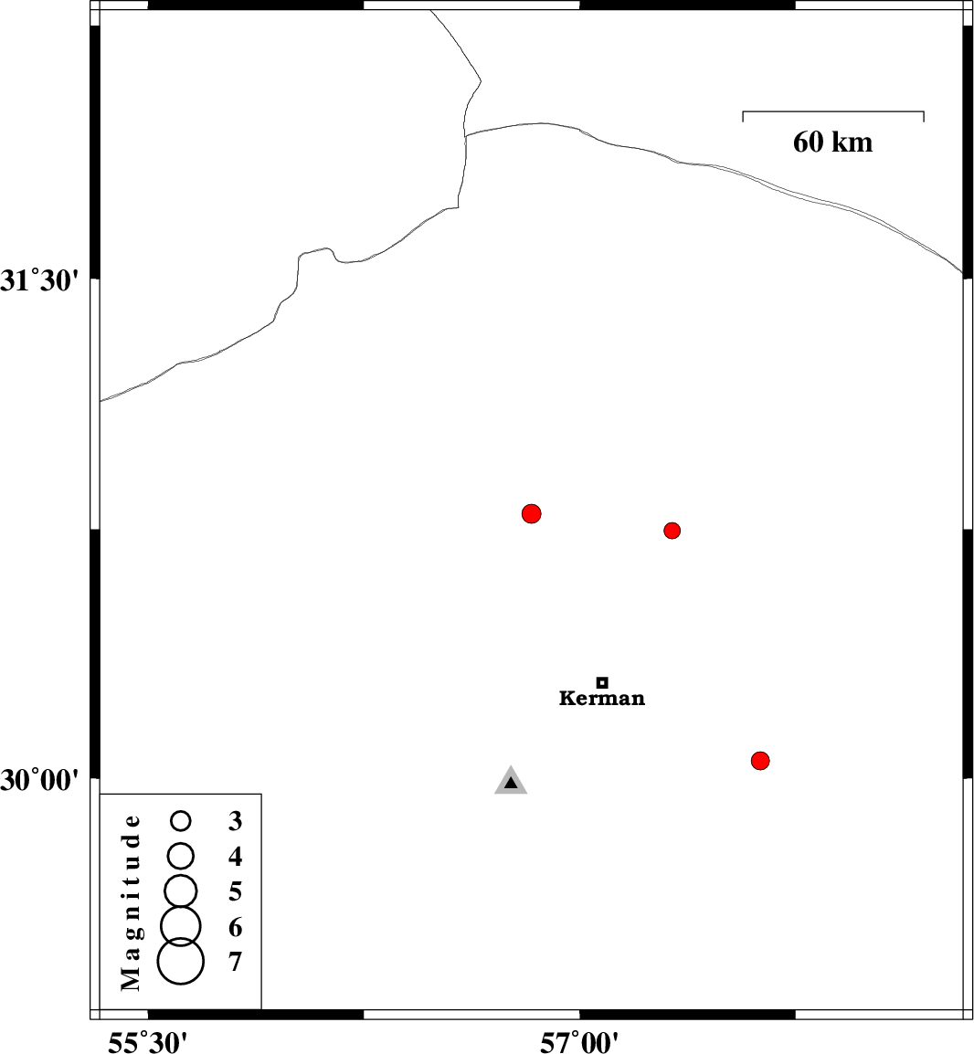 | 2017/05/13 | 04:57:47.2 | 09:27:47.2 | 30.746 | 57.321 | 14 | ML:2.5 | Kerman Province, 56 km North-East of Kerman |