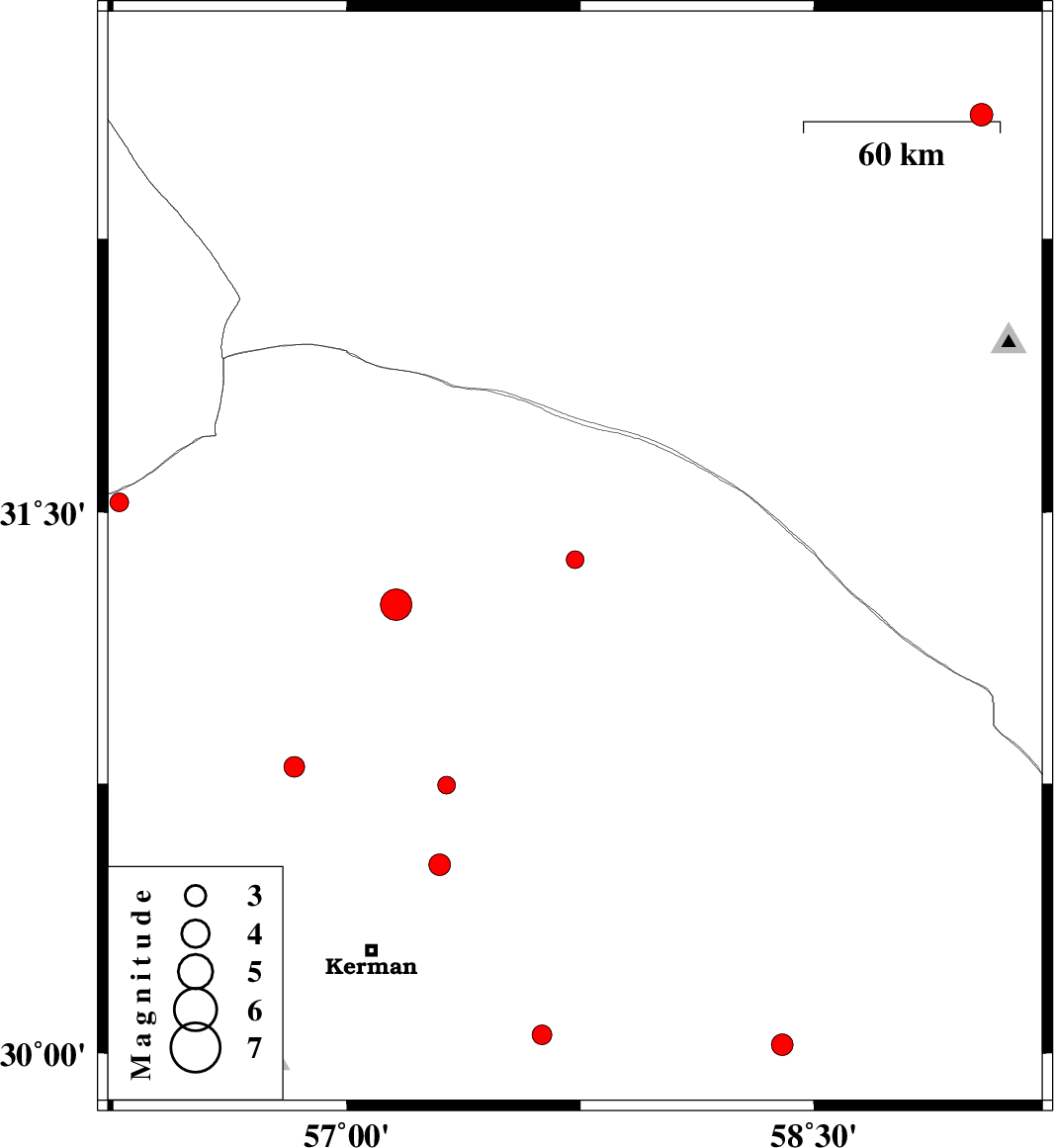 | 2017/05/01 | 09:45:08.8 | 14:15:08.8 | 30.024 | 58.399 | 15 | ML:3.1 | Kerman Province, 102 km North of Bam | ||