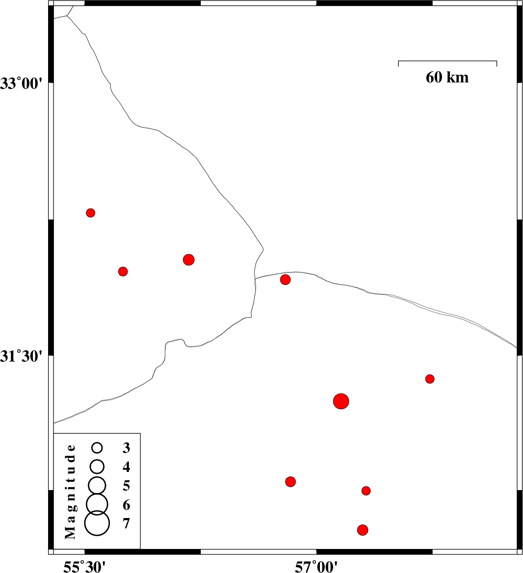 | 2017/05/11 | 01:26:57.1 | 05:56:57.1 | 32.029 | 56.173 | 14 | ML:3.3 | Yazd Province, 87 km North-East of Bafq | ||