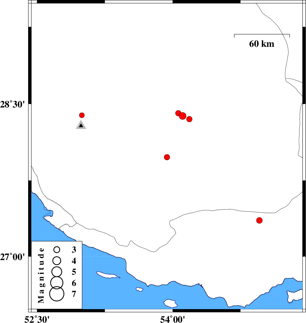| 2017/06/02 | 12:11:57.8 | 16:41:57.8 | 28.382 | 54.11 | 7 | ML:3.5 | Fars Province, 55 km South-East of Jahrom | ||
