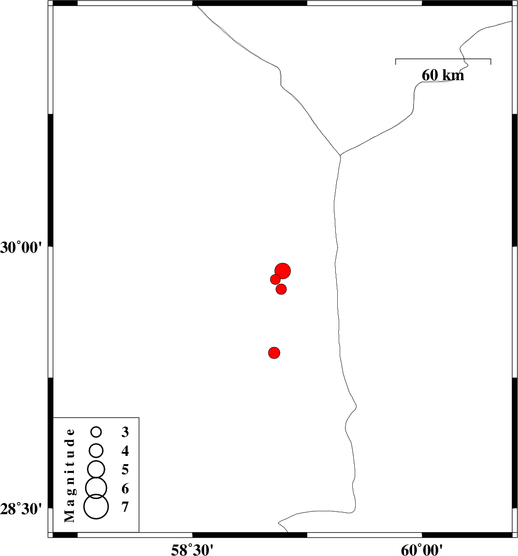 | 2017/06/10 | 04:34:56.1 | 09:04:56.1 | 29.812 | 59.041 | 14 | ML:2.9 | Kerman Province, 102 km North-East of Bam | ||