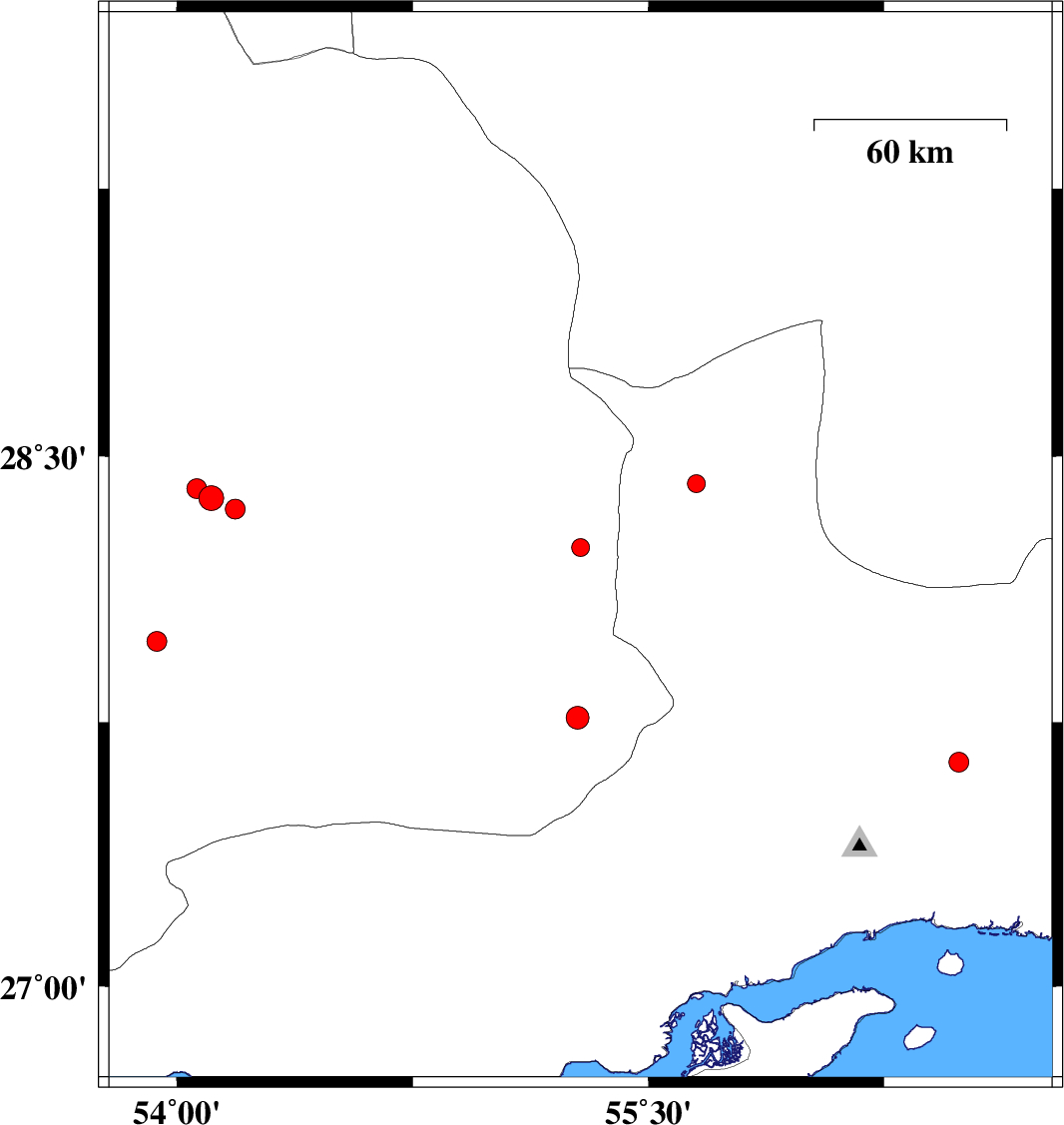 | 2017/06/02 | 12:11:57.8 | 16:41:57.8 | 28.382 | 54.11 | 7 | ML:3.5 | Fars Province, 55 km South-East of Jahrom | ||