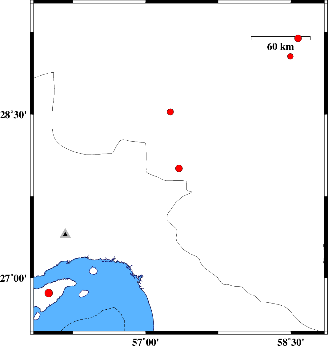 | 2017/06/14 | 10:14:46.0 | 14:44:46.0 | 26.859 | 56 | 7 | ML:3.7 | Persian Gulf, 28 km -West of Qeshm | ||