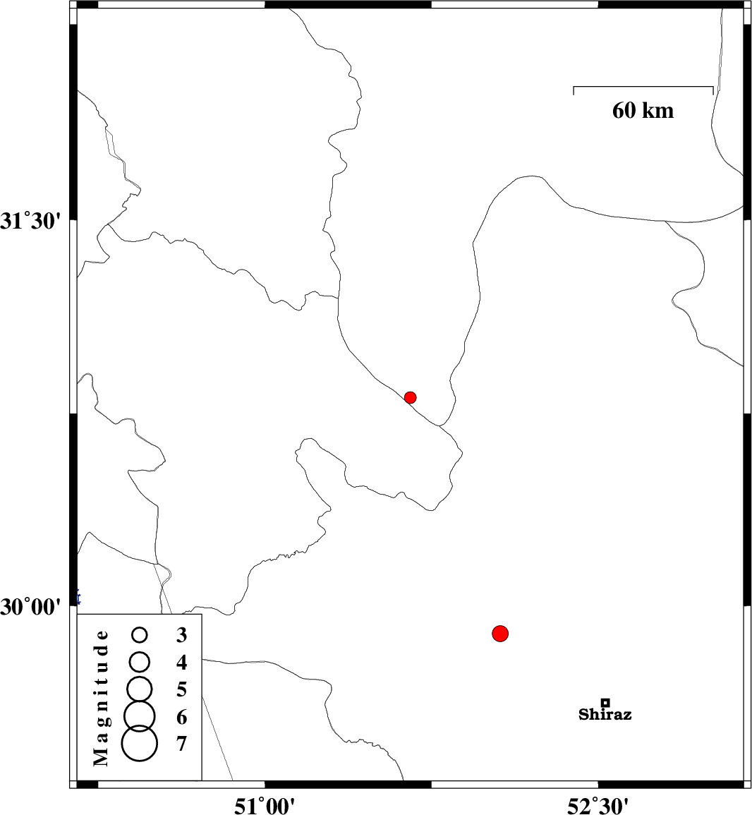| 2017/06/15 | 07:45:18.2 | 12:15:18.2 | 29.891 | 52.059 | 18 | ML:3.3 | Fars Province, 42 km South of Ardakan |