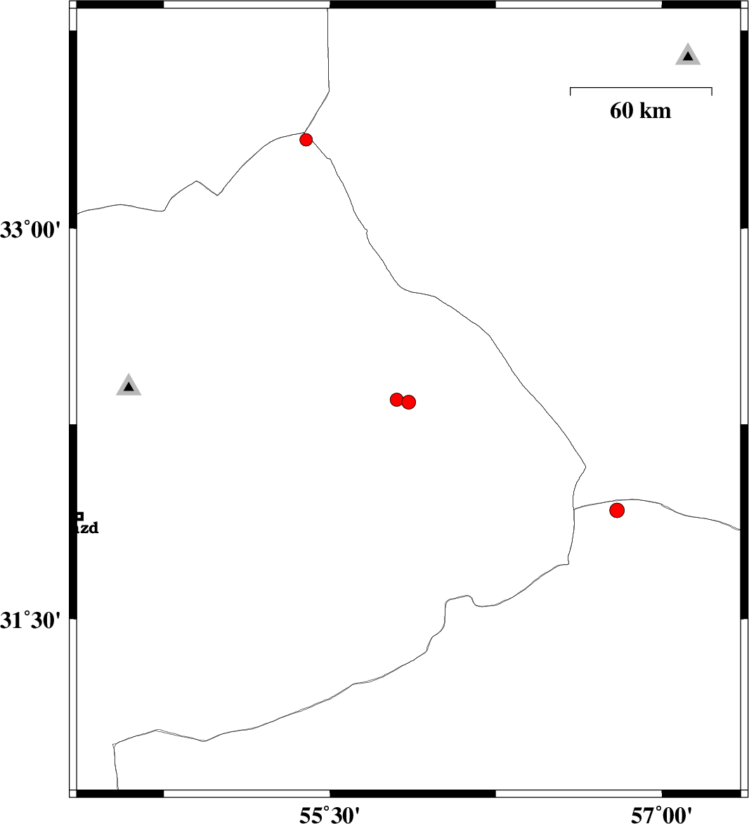 | 2017/06/16 | 07:23:02.5 | 11:53:02.5 | 32.344 | 55.803 | 16 | ML:2.7 | Yazd Province, 91 km North-East of Bafq | ||