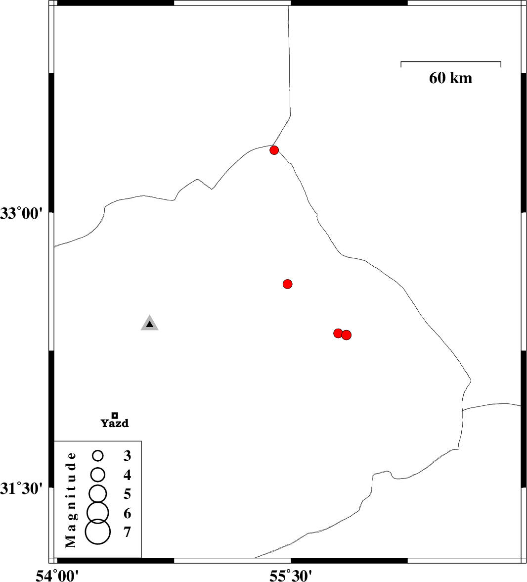 | 2017/06/16 | 07:23:02.5 | 11:53:02.5 | 32.344 | 55.803 | 16 | ML:2.7 | Yazd Province, 91 km North-East of Bafq | ||