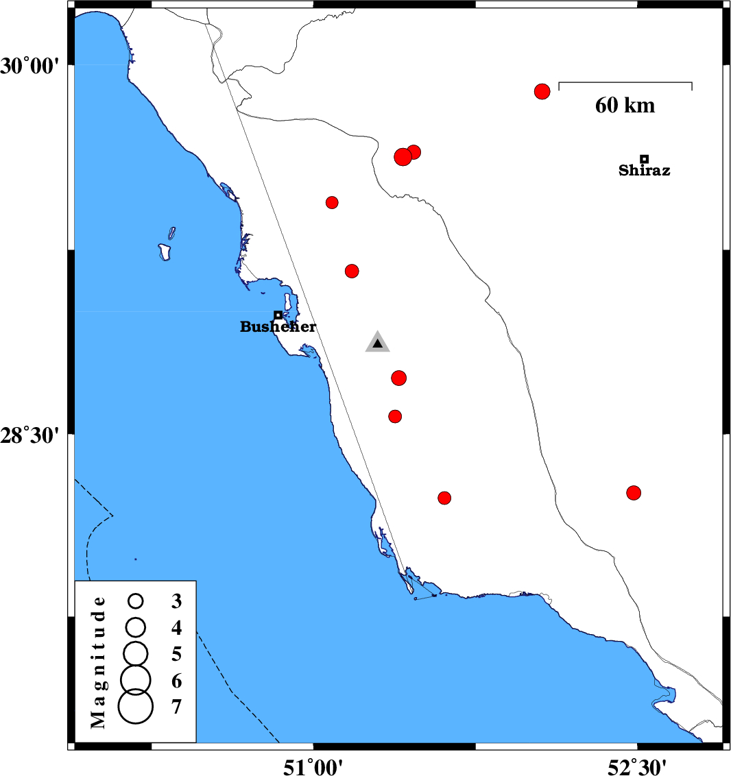 | 2017/07/03 | 05:12:38.3 | 09:42:38.3 | 28.729 | 51.395 | 17 | ML:3.1 | Bushehr Province, 9 km of Khormog | ||