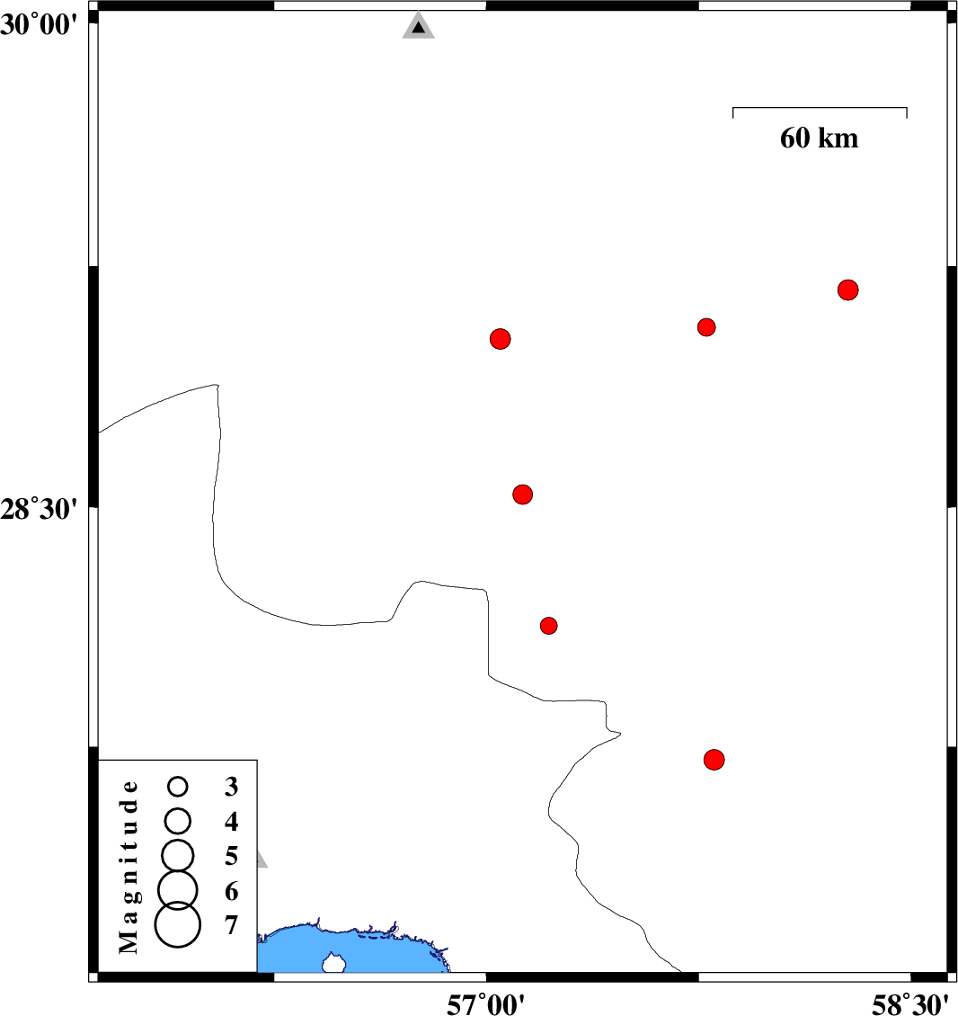 | 2017/07/04 | 03:59:59.3 | 08:29:59.3 | 28.539 | 57.128 | 6 | ML:3.1 | Kerman Province, 61 km South-West of Jiroft | ||