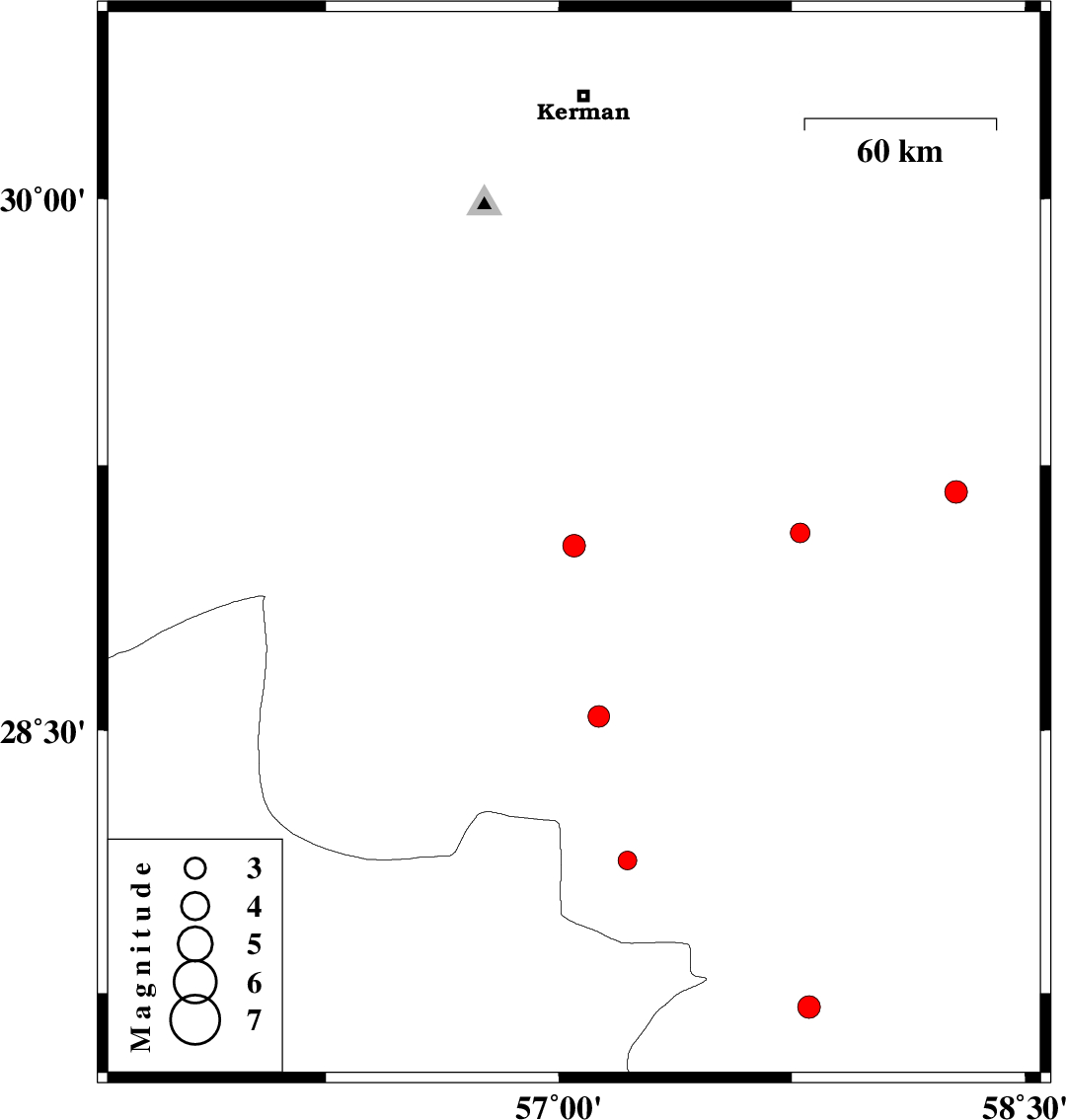| 2017/07/04 | 03:59:59.3 | 08:29:59.3 | 28.539 | 57.128 | 6 | ML:3.1 | Kerman Province, 61 km South-West of Jiroft | ||