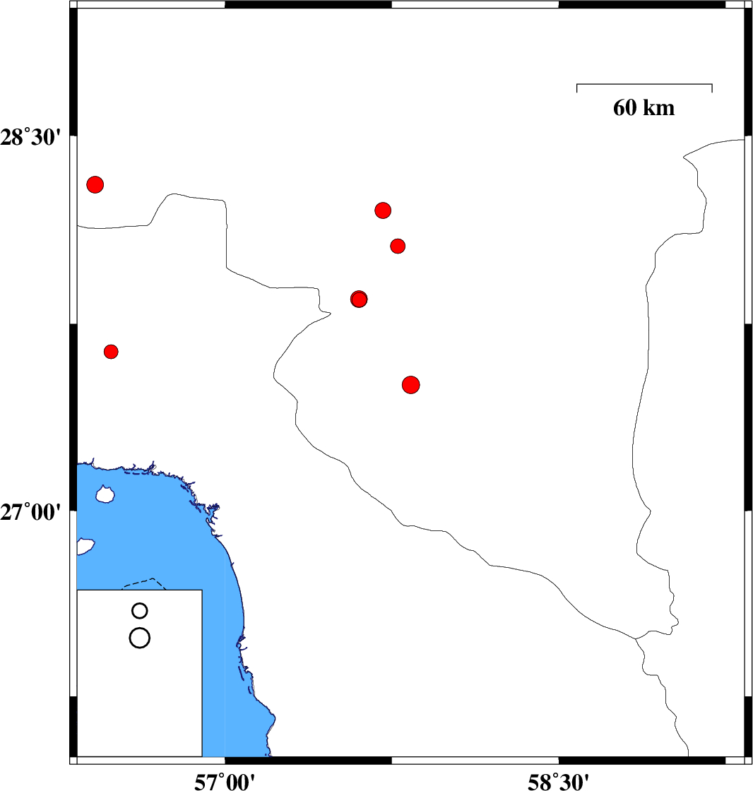| 2017/05/19 | 05:29:10.7 | 09:59:10.7 | 27.846 | 57.604 | 14 | ML:2.9 | Kerman Province, 15 km South of Kahnuj | ||