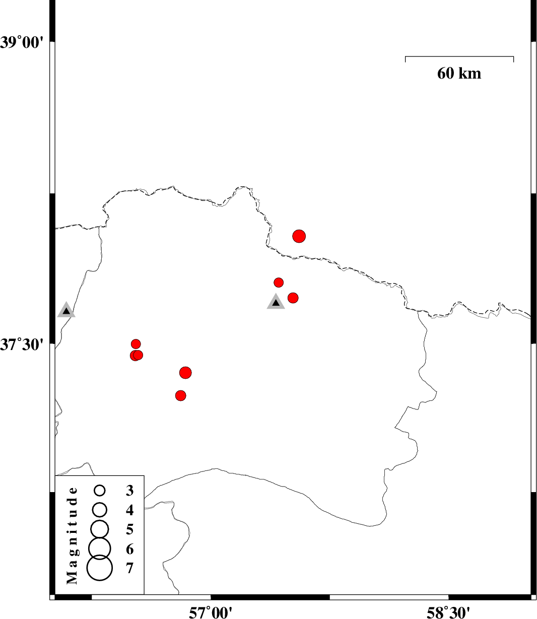 | 2017/07/10 | 07:04:53.0 | 11:34:53.0 | 38.037 | 57.557 | 6 | ML:3.6 | , 66 km North-East of Bojnurd | ||
