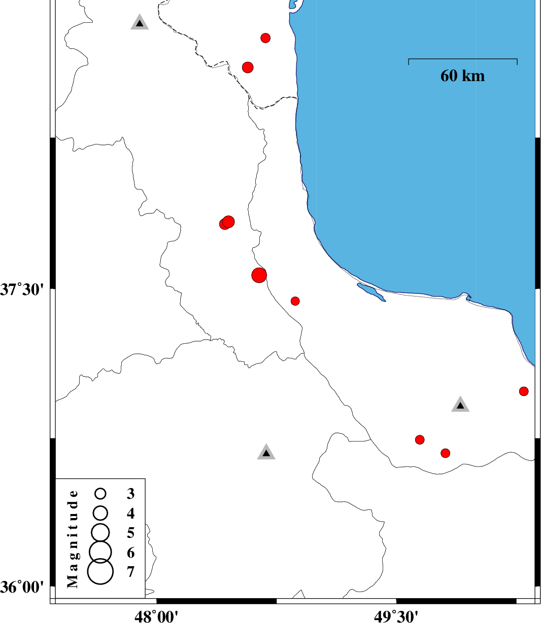 | 2017/07/15 | 07:36:04.2 | 12:06:04.2 | 37.438 | 48.866 | 14 | ML:2.4 | Gilan Province, 27 km -West of Masal | ||