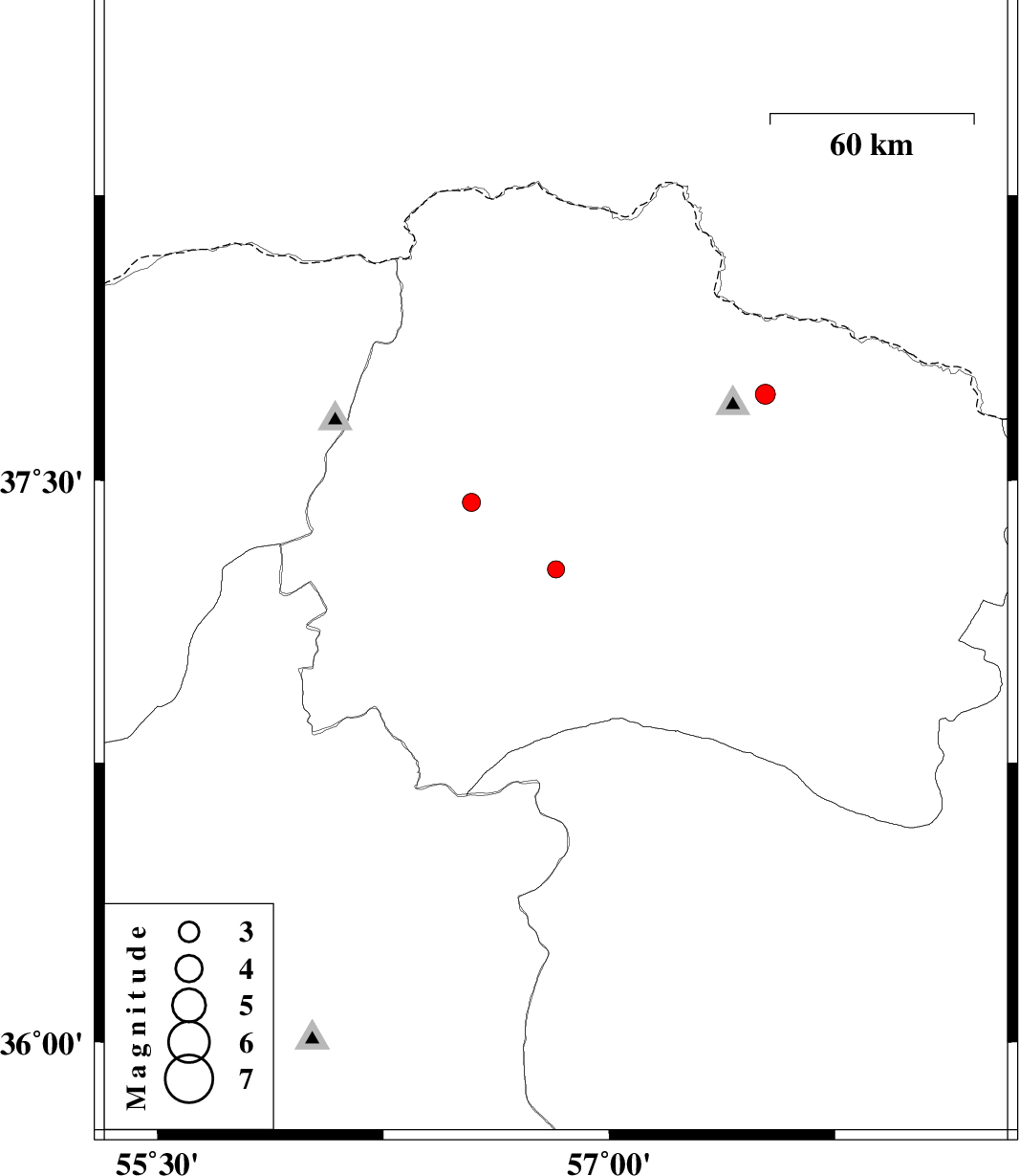 | 2017/07/12 | 01:50:44.9 | 06:20:44.9 | 37.442 | 56.542 | 14 | ML:2.7 | Khorasan(north) Province, 37 km South-West of Ashkhaneh |