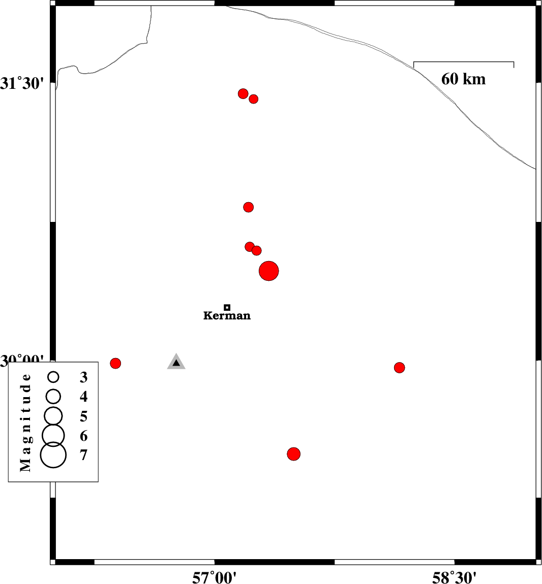 | 2017/07/23 | 17:32:12.3 | 22:02:12.3 | 30.065 | 57.634 | 11 | Mb:5.5 | Kerman Province, 59 km South-East of Kerman | ||