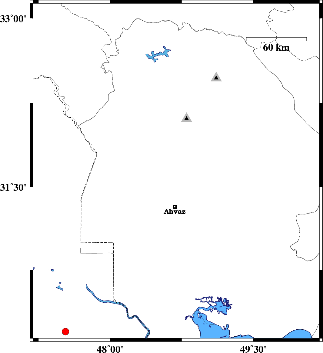 | 2017/08/01 | 16:26:48.7 | 20:56:48.7 | 31.631 | 48.693 | 15 | ML:2.8 | Khoozestan Province, 35 km North of Ahvaz |