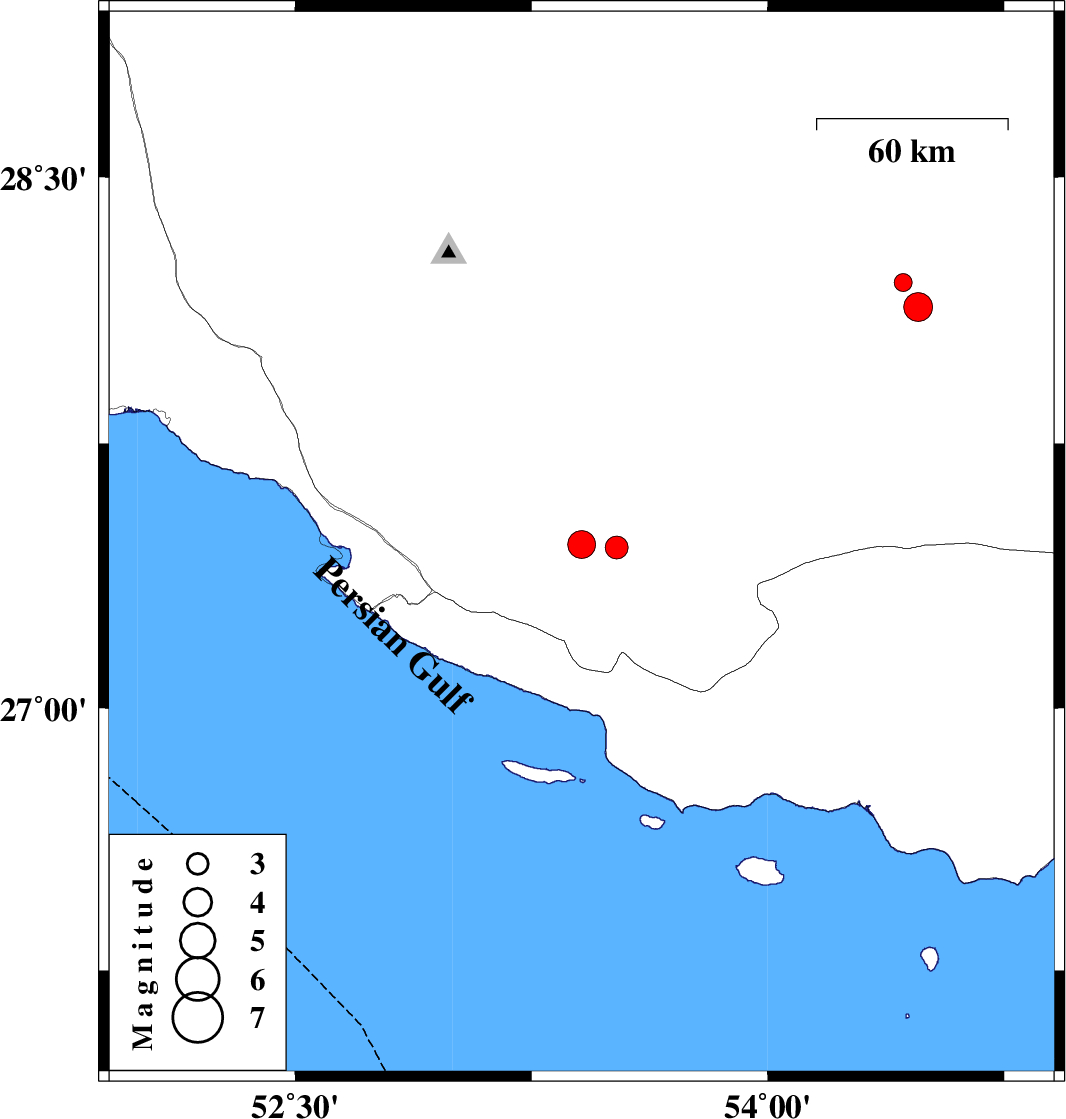 | 2017/08/10 | 13:50:15.3 | 18:20:15.3 | 27.464 | 53.409 | 15 | ML:3.9 | Fars Province, 28 km North-East of Lamerd | ||