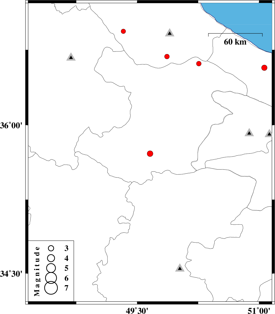 | 2017/08/13 | 00:52:32.5 | 05:22:32.5 | 36.934 | 49.329 | 14 | ML:2.6 | Gilan Province, 15 km North of Rudbar | ||