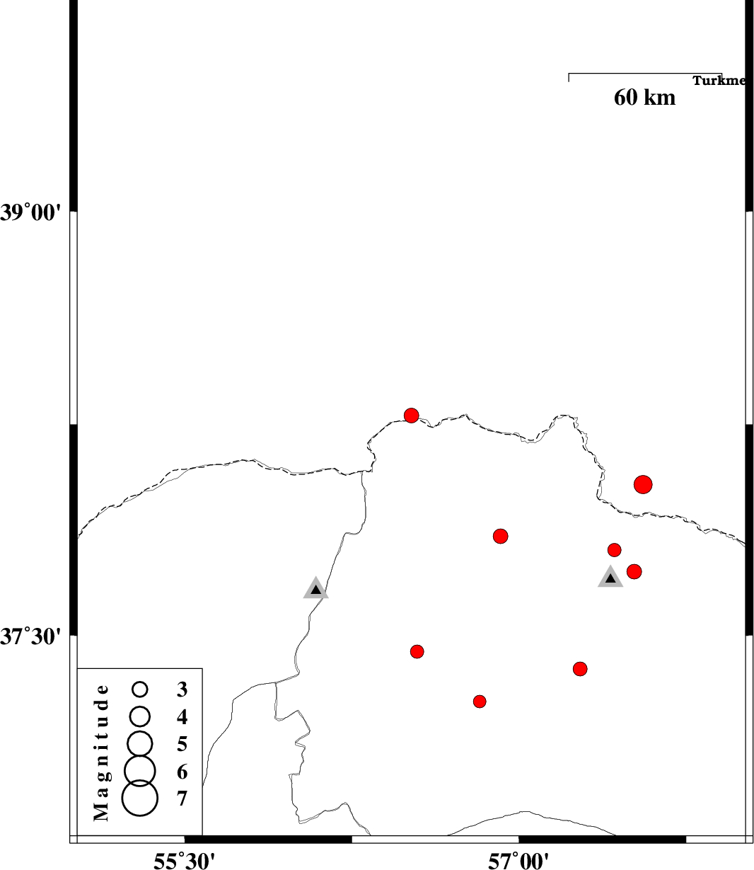 | 2017/07/10 | 07:04:53.0 | 11:34:53.0 | 38.037 | 57.557 | 6 | ML:3.6 | , 66 km North-East of Bojnurd | ||