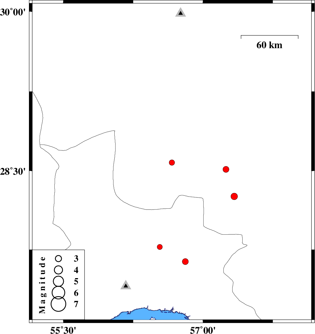 | 2017/08/04 | 19:42:56.1 | 00:12:56.1 | 28.514 | 57.247 | 14 | ML:3 | Kerman Province, 51 km South-West of Jiroft | ||