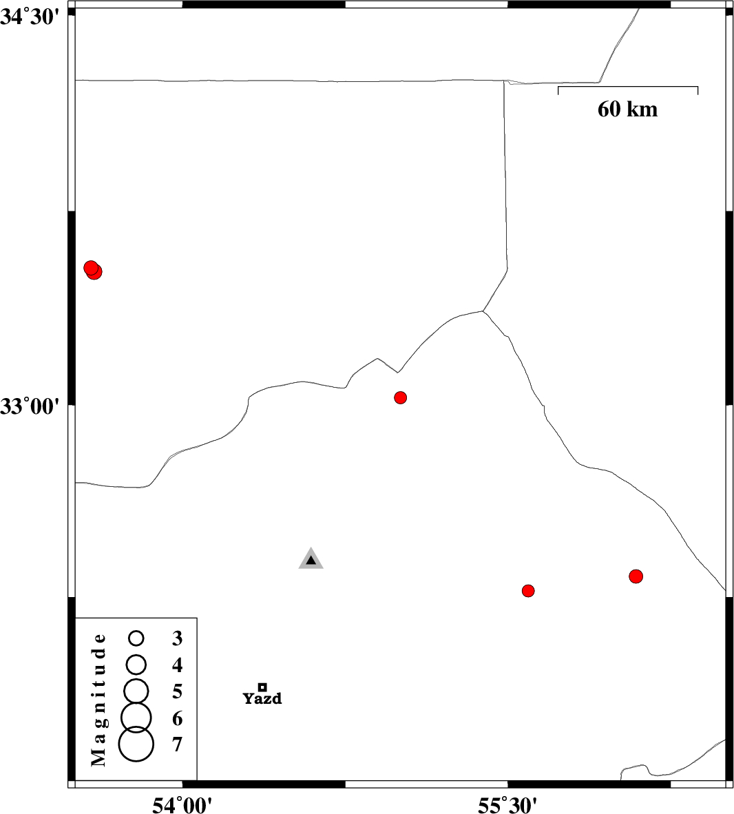 | 2017/07/14 | 01:17:32.3 | 05:47:32.3 | 32.274 | 55.593 | 18 | ML:2.5 | Yazd Province, 77 km North-East of Bafq |