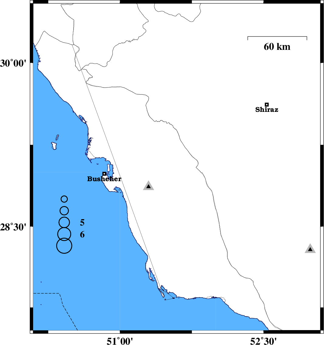 | 2017/09/06 | 10:22:35.8 | 14:52:35.8 | 29.038 | 51.593 | 16 | ML:3.5 | Bushehr Province, 37 km North-East of Ahram | ||