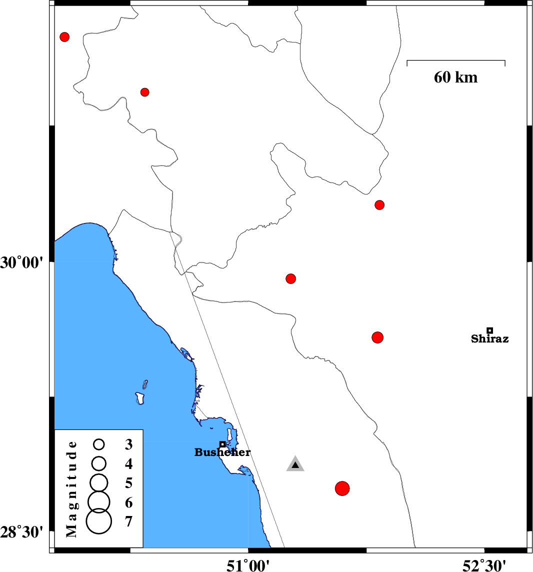| 2017/10/02 | 06:22:28.1 | 09:52:28.1 | 29.906 | 51.269 | 14 | ML:2.8 | Fars Province, 34 km South-West of Nurabad | ||