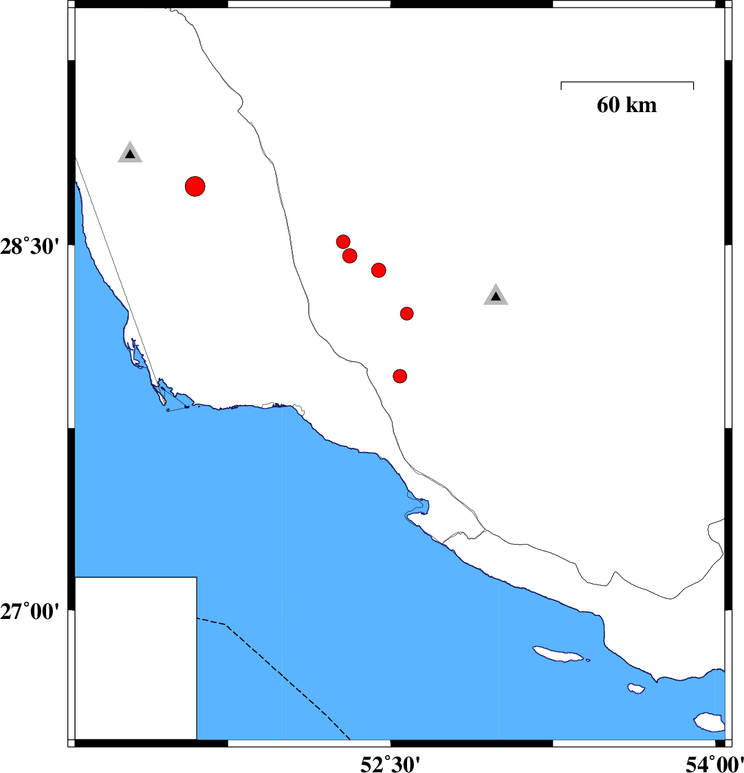 | 2017/10/05 | 01:42:33.2 | 05:12:33.2 | 28.219 | 52.575 | 14 | ML:2.7 | Fars Province, 68 km South of Firuz Abad | ||