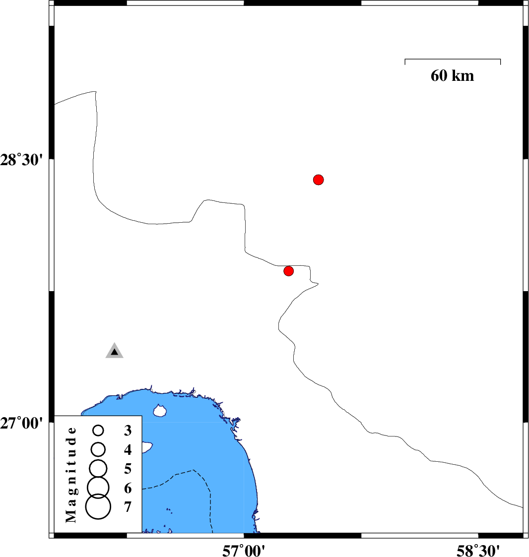 | 2017/10/01 | 01:08:05.0 | 04:38:05.0 | 28.382 | 57.476 | 14 | ML:2.9 | Kerman Province, 41 km South-West of Jiroft |