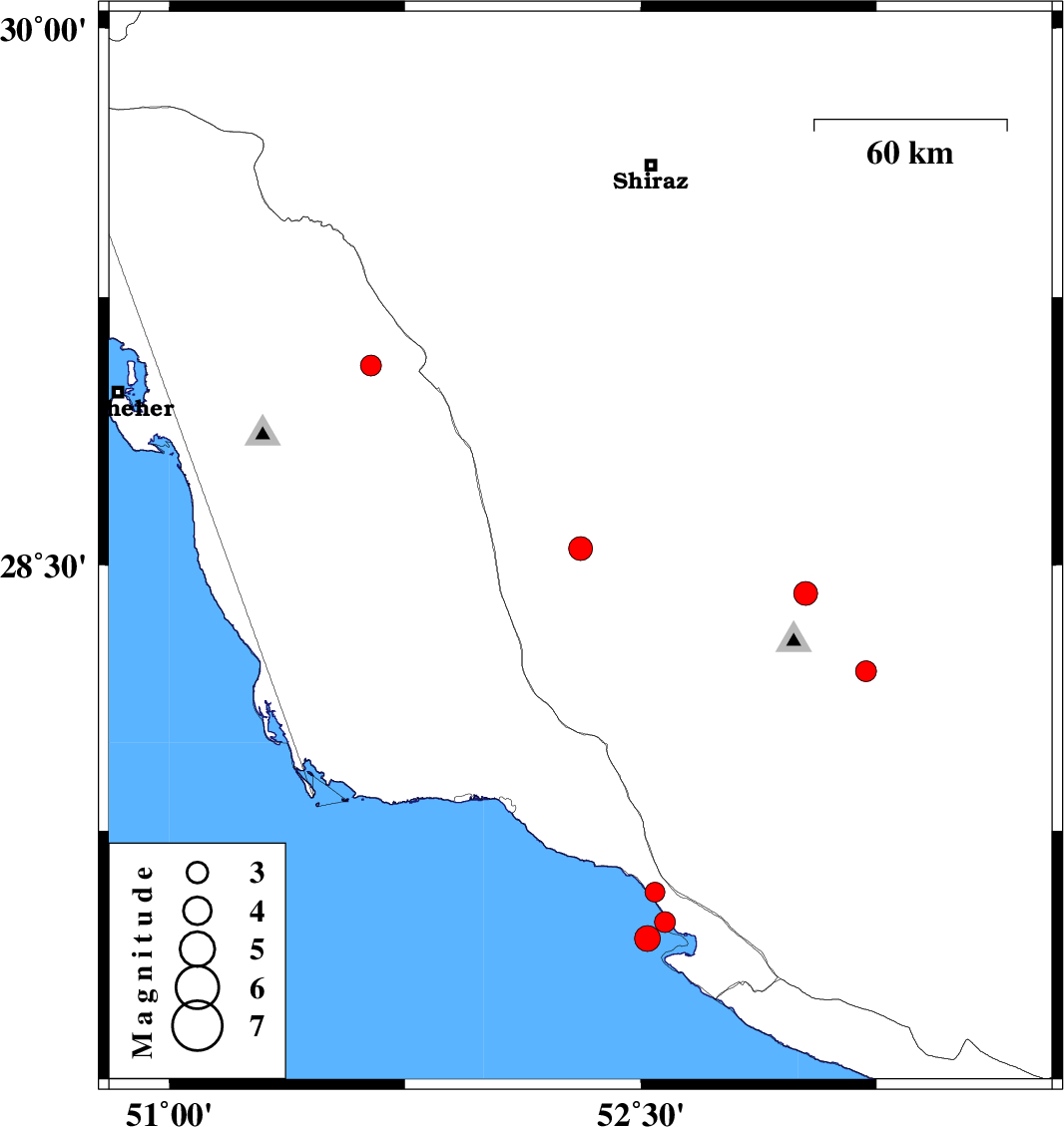 | 2017/10/14 | 18:11:51.3 | 21:41:51.3 | 27.491 | 52.576 | 15 | ML:2.9 | Persian Gulf, 31 km -West of Mehr | ||
