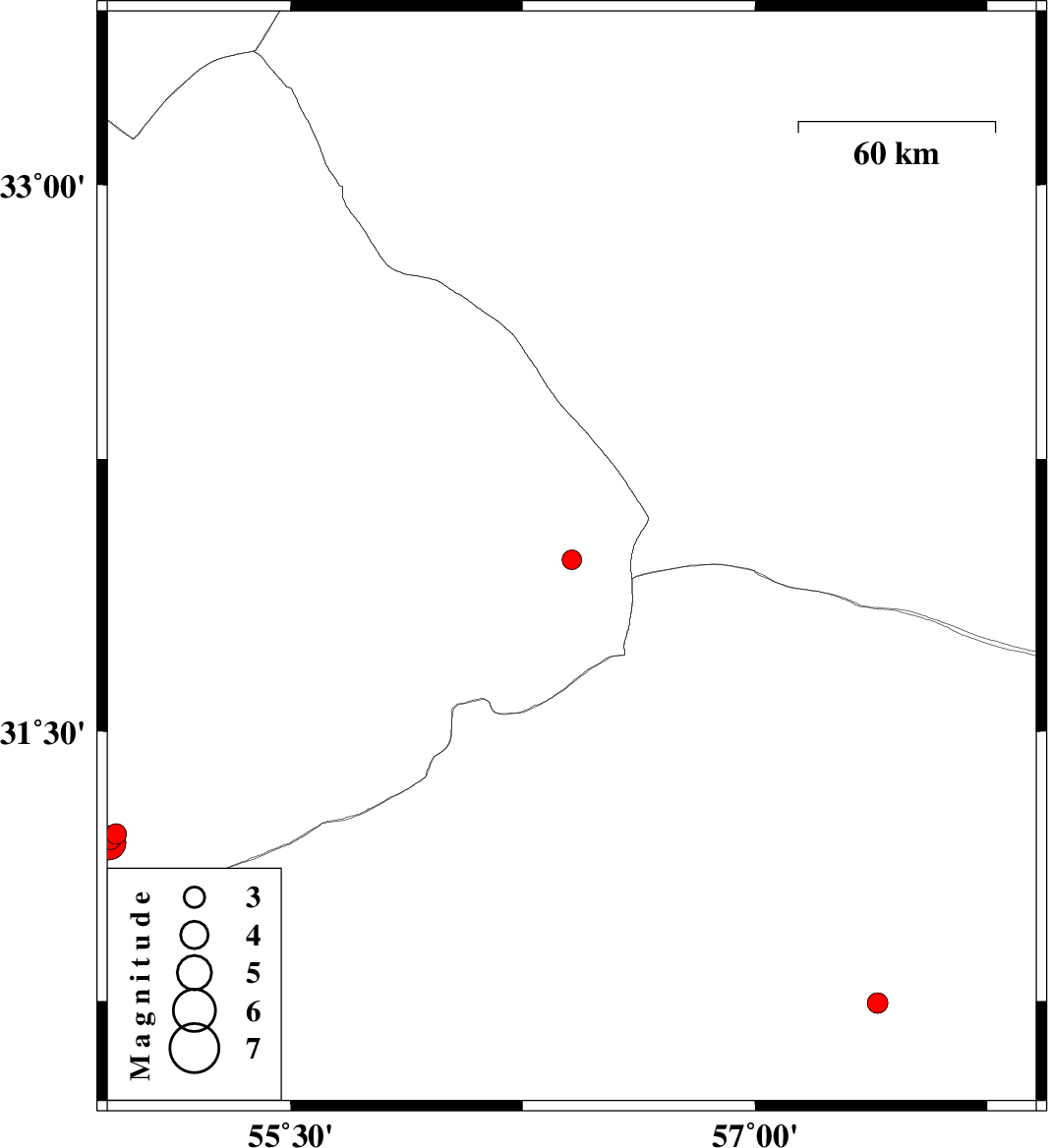 | 2017/10/20 | 13:14:36.4 | 16:44:36.4 | 30.745 | 57.396 | 18 | ML:3 | Kerman Province, 59 km North-East of Kerman | ||