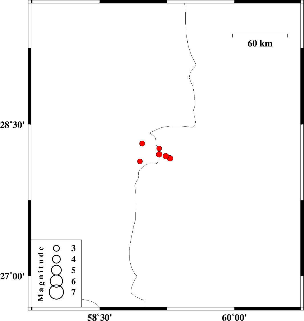 | 2017/10/04 | 08:24:46.3 | 11:54:46.3 | 28.135 | 58.949 | 14 | ML:2.5 | Kerman Province, 125 km North-East of Kahnuj | ||