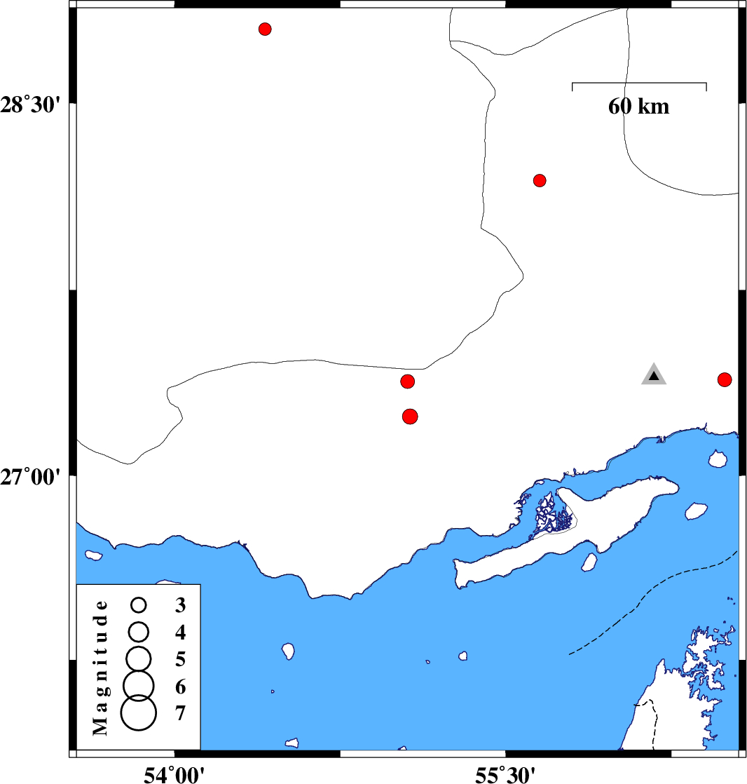 | 2017/10/22 | 00:13:15.3 | 03:43:15.3 | 27.239 | 55.067 | 14 | ML:3.1 | Hormozgan Province, 70 km -East of Bastak | ||
